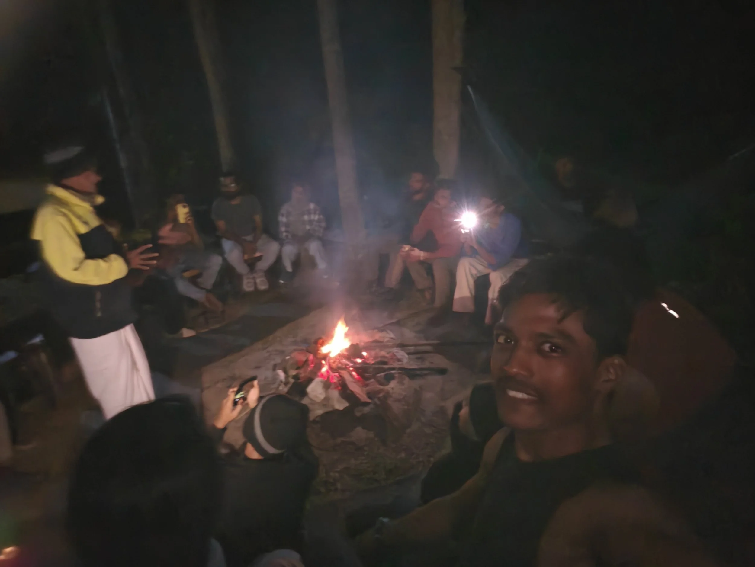 சிறு தூக்கத்திற்கு பின் கூடாரத்தை விட்டு வெளிய வந்து புல் மீது அமர்ந்து, அழகிய அந்த இரு சூழ் காட்சியினையும், சிலு சிலுவென வீசும் குளிர் காற்றை உள்வாங்கிக்கொண்டும், எங்கள் வாழ்க்கை கோட்பாட்டினை பற்றி அமைதியாய் அன்பாய் உரையாடி கொண்டிருந்தோம்.